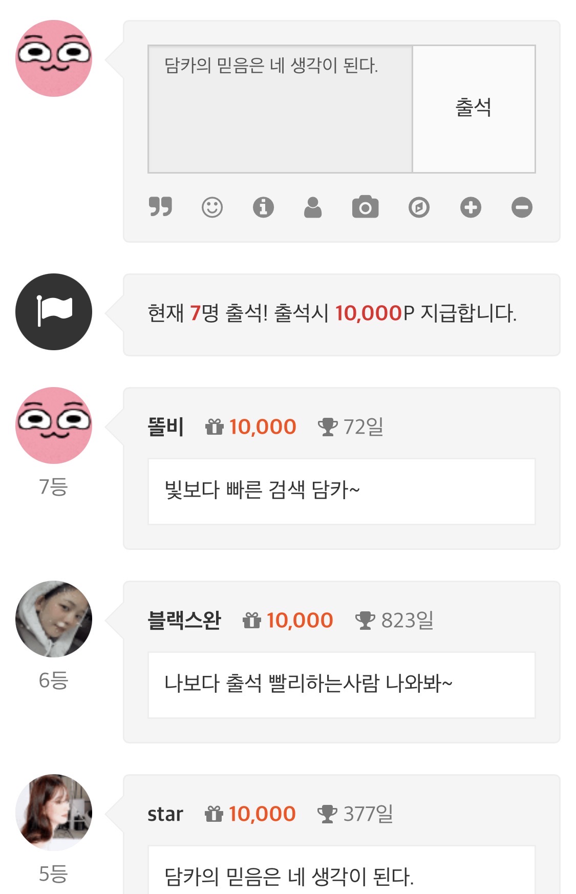 럭키 세븐 똘비 3 3 0 1시간전 럭키세븐입니다 감사합니다 ㅅ ㅅ 3 0 https://daumdca.com/bbs/board.php?bo_table=free&wr_id=6106837 Author 0 0 Lv.대령 똘비 대령 41,083,199 (69%) 똘비님 보유 포인트 : P 5,690,476 +3 02.13 럭키 세븐 02.13 빛보다 빠른 검색 담카~ +4 02.12 손가락힘이없내요 +9 02.12 감사합니다 +10 02.12 출근
