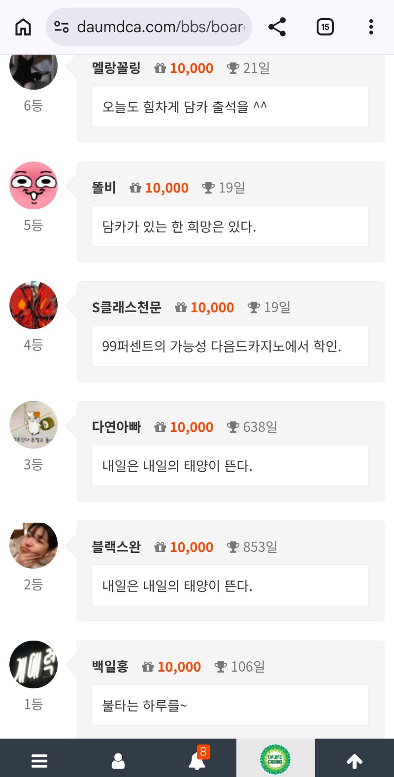 순방 나이서ㅅ 다연아빠 1 1 0 1시간전 1 0 https://daumdca.com/bbs/board.php?bo_table=free&wr_id=6184538 Author 9 4 Lv.중령 다연아빠 중령 163,316,393 (56%) 다연아빠님 보유 포인트 : P 3,349,828 03.15 퐈이야~ +1 03.15 순방 나이서ㅅ 03.15 내일은 내일의 태양이 뜬다. +2 03.14 출첵 대기! +10 03.14 맛저하세요~
