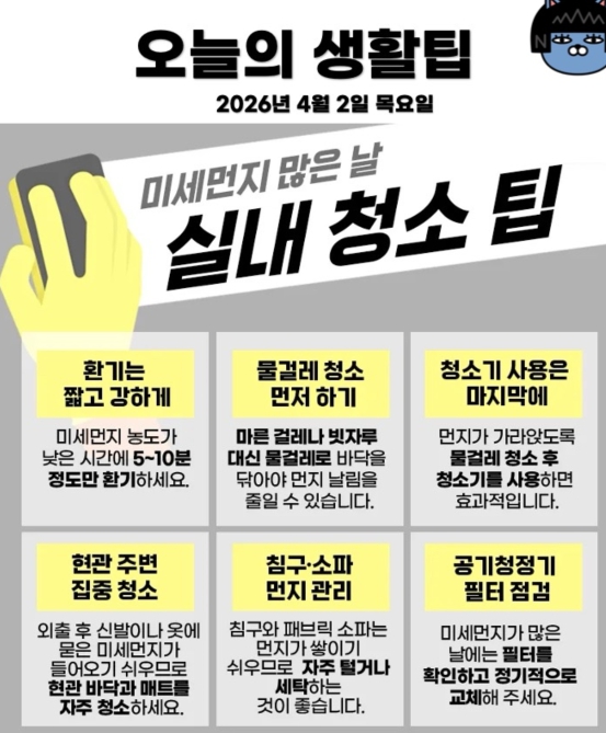 2일 생활꿀팁스 S클래스천문 4 1 1 2시간전 미먼많은 날 실내청소 꿀팁스 ㅅㅅㅅㅅㅅㅅㅅㅅ 1 1 https://daumdca.com/bbs/board.php?bo_table=free&wr_id=6223268 Author 3 0 Lv.중장 S클래스천문 중장 78,670,491 (38%) S클래스천문님 보유 포인트 : P 12,802,295 +1 04.02 5퇴분들시간이네요 +7 04.02 나이스근하게 ㅅㅅㅅㅅ +4 04.02 2일 생활꿀팁스 +3 04.02 오늘의 운세 +4 04.02 오늘의 날씨 2026년 4월 2일 목요일